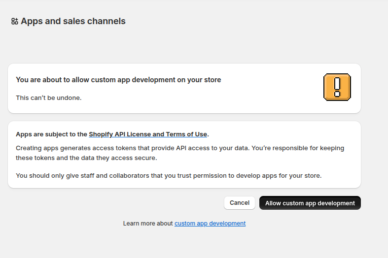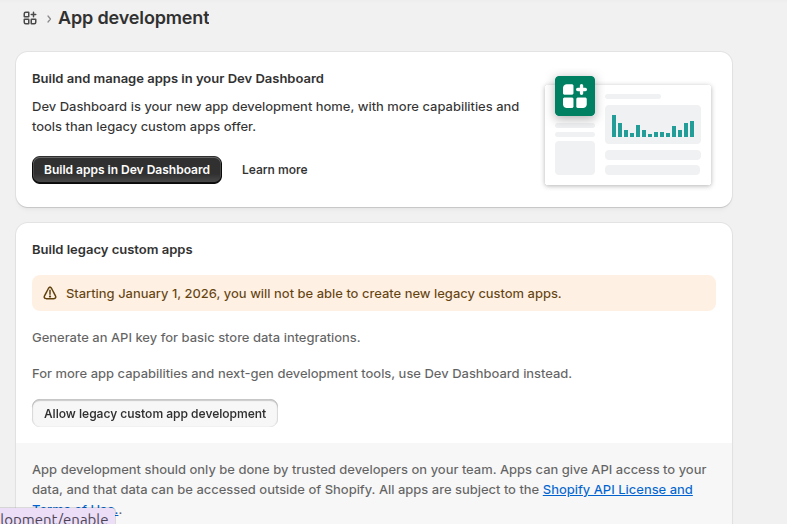 • If it’s disabled, Shopify will prompt you to enable custom app development.