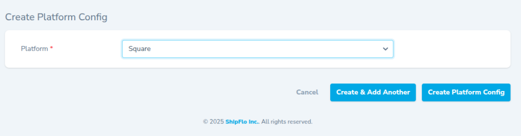 • Select Square, click Create Platform Config, then click Connect.